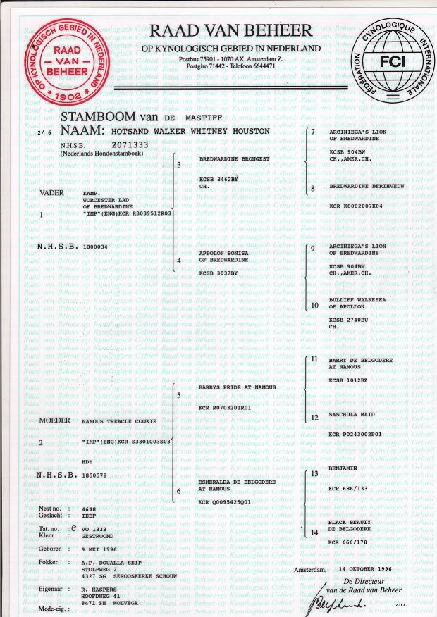 9-5-1996 - 23-1-2004 Stamboom Alcor Dit is Alcor, haar echte naam is 'Hotsand Walker Whitney Houston'. Ze was onze eerste mastiff. Voor een teef was ze erg groot en vooral ook erg lui. De lol van een bal of stok achterna rennen zag ze niet en de vijver gebruikte ze alleen om in pootje te baden. |